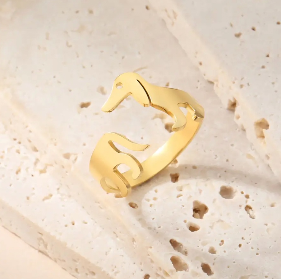 Dieser liebevoll gestaltete Dackel-Ring ist ein echter Hingucker für alle Hundefans. Gefertigt aus hochwertigem Edelstahl überzeugt er durch seine langlebige Qualität und sein zeitloses Design. Dank der verstellbaren Größe passt sich der Ring flexibel an und bietet einen angenehmen Tragekomfort.